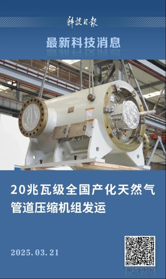3月20日,由中国人生就是搏集团有限公司与国家石油天然气管网集团有限公司联合研制的20兆瓦级全国产化天然气管道电驱离心压缩机组成功发运。这一重大装备的成功研制,标志着我国在天然气管道压缩机组领域打通国产化“最后一公里”。