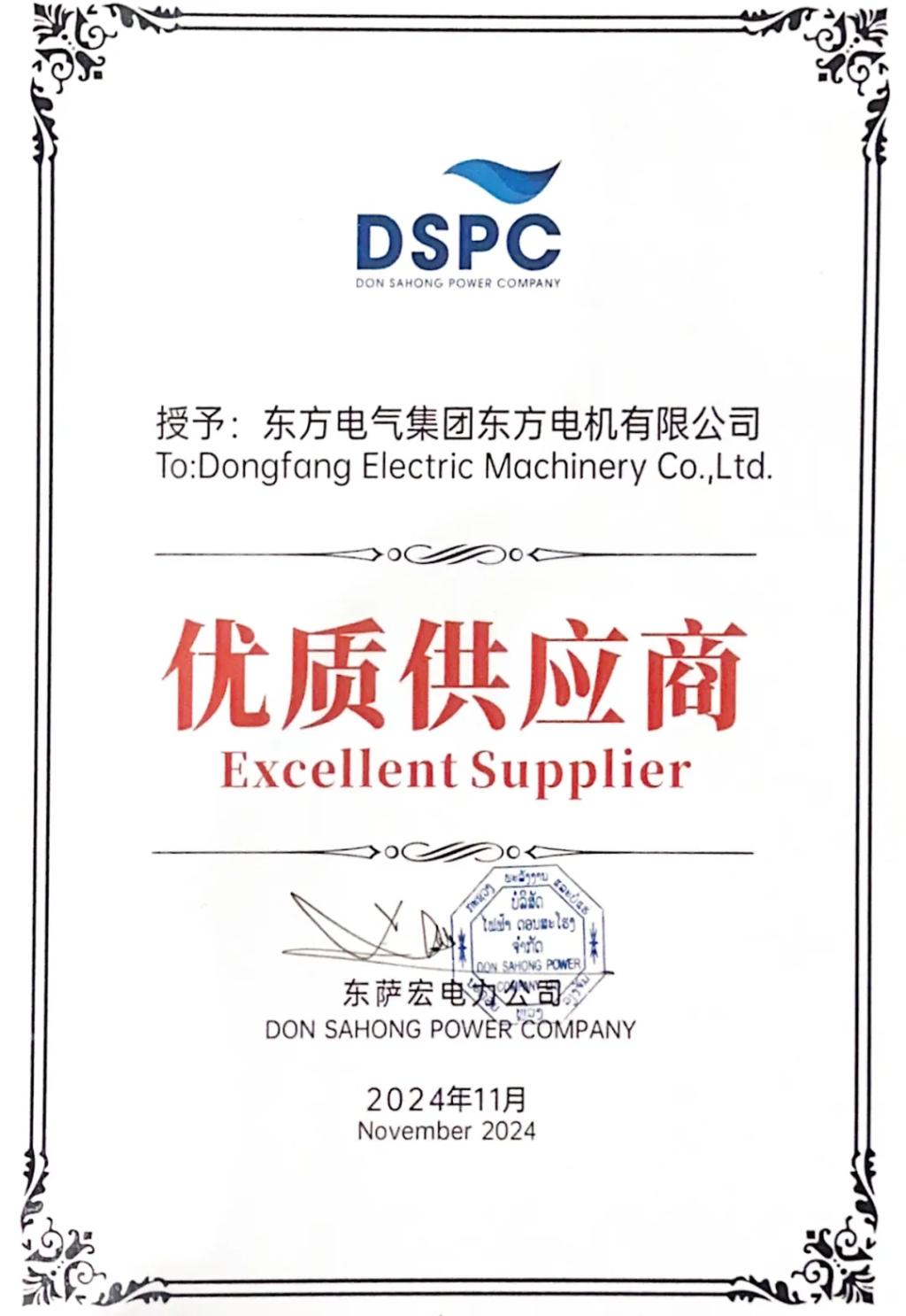 东萨宏电力公司向东方电机颁发的“优质供应商”证书,是对机组运行优异的最好证明。